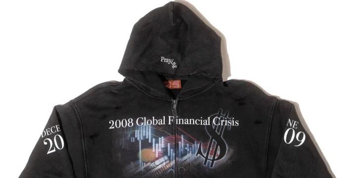 A $180 hoodie with “2008 Global Financial Crisis” emblazoned across the front is sold out online. The black hoodie is also described as “hurt and mangled” with “extreme distressing” by a streetwear brand called Praying.
