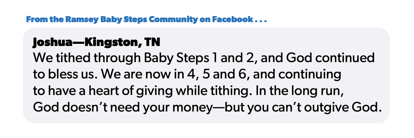 “We tithed through Baby Steps 1 and 2, and God continued to bless us,” said Joshua in the Ramsey Baby Steps Community. “We are now in 4, 5 and 6 and continuing to have a heart of giving while tithing. In the long run, God doesn’t need your money—but you can’t outgive God.”