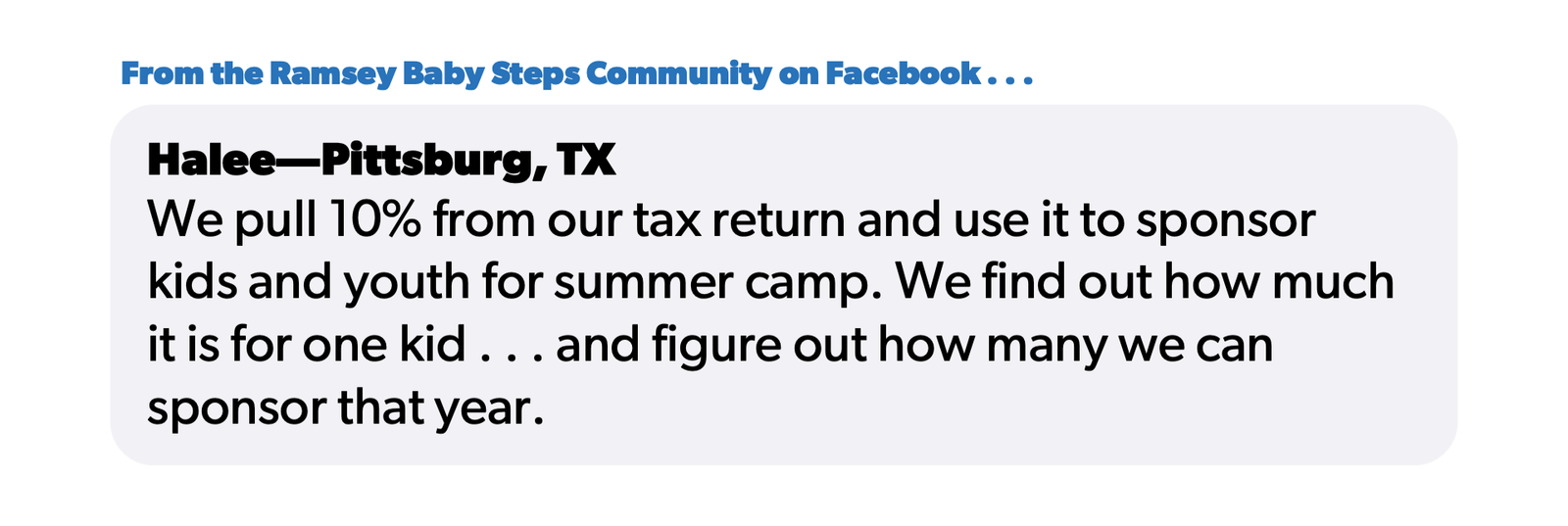 Lots of folks in the Ramsey Baby Steps Community get creative with their refunds. Halee shared, “We pull 10% from our tax return and use it to sponsor kids and youth for summer camp.” She and her husband find out how much it costs per camper and see how many they can help each year.